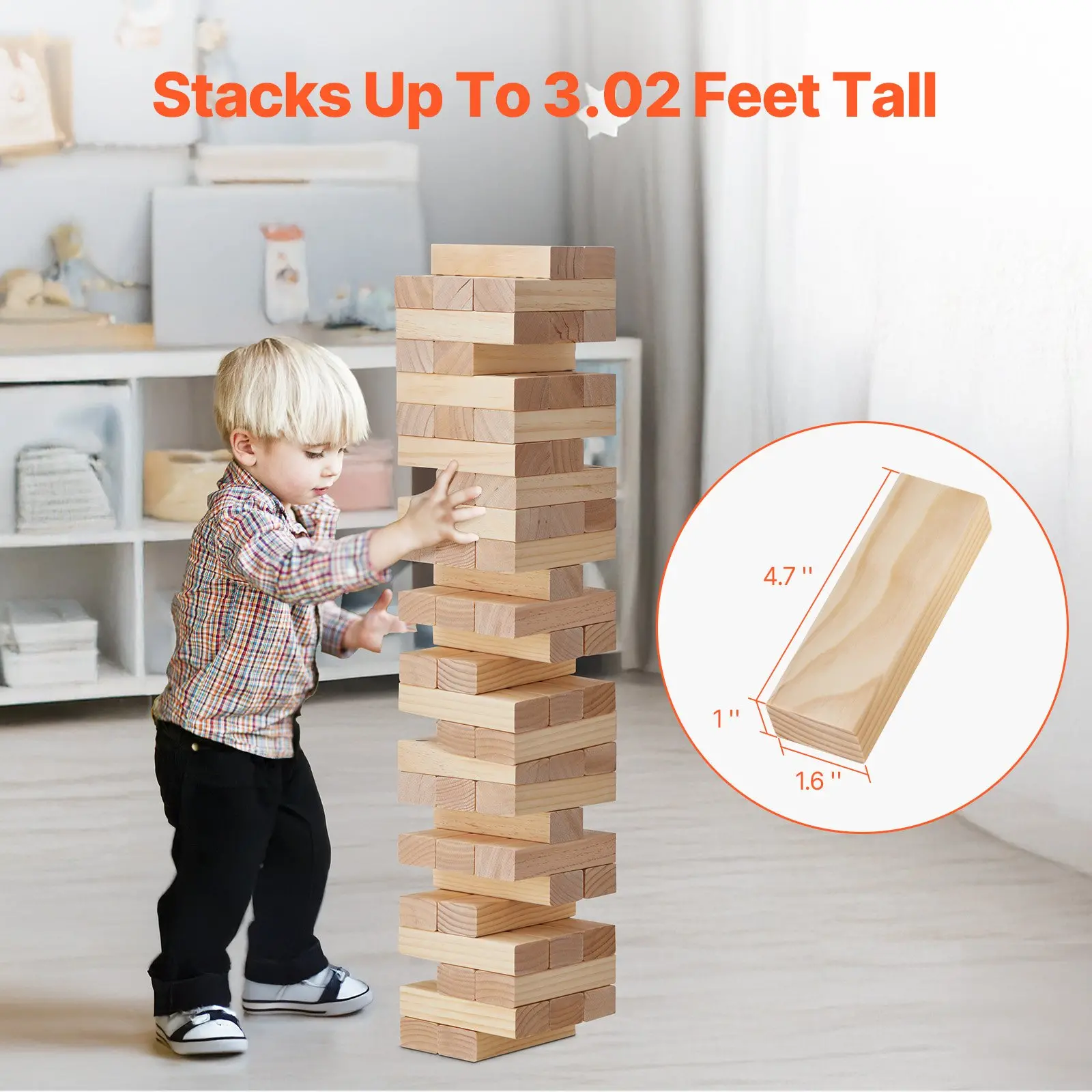 Block Count: 54(Includes 28 Domino Blocks),Standard Stacking Height (3 Blocks per Row): 17.7″ / 450 mm,Single Block Size: 4.7″ x 1.6″ x 1.0″ / 120 x 40 x 25 mm,Item Model Number: NTGW1401,Product Weight: 7.1 lbs / 3.2 kg,Product Dimensions: 4.7″ x 4.7″ x 17.7″ / 120 x 120 x 450 mm